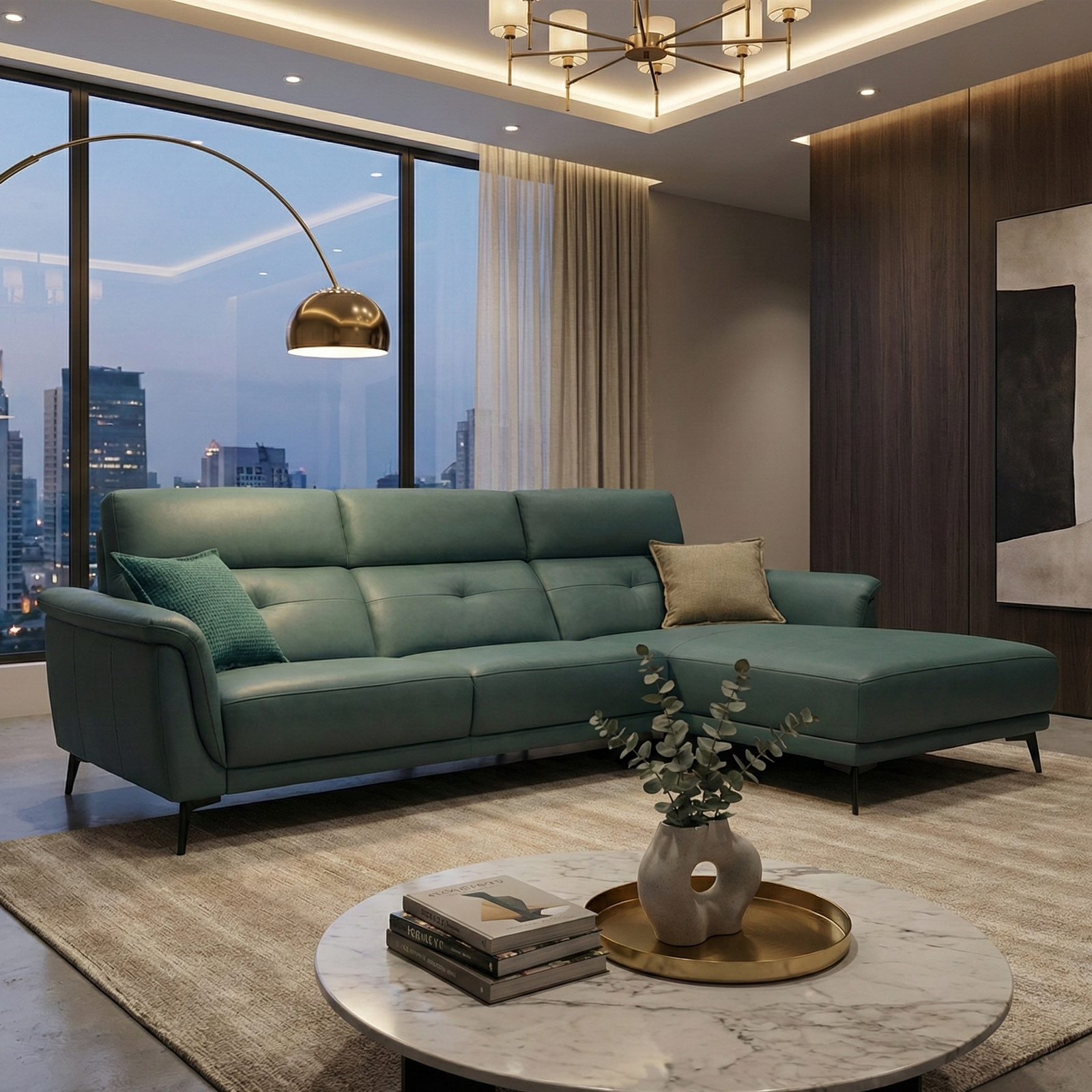 Discover the Corvin Sectional Sofa, the epitome of contemporary elegance and ergonomic comfort. This beautiful sofa is upholstered in luxurious top-grain leather and features plush, supportive cushions. Its chic, elevated profile brings a sense of spaciousness to your living room, making it the perfect centerpiece.