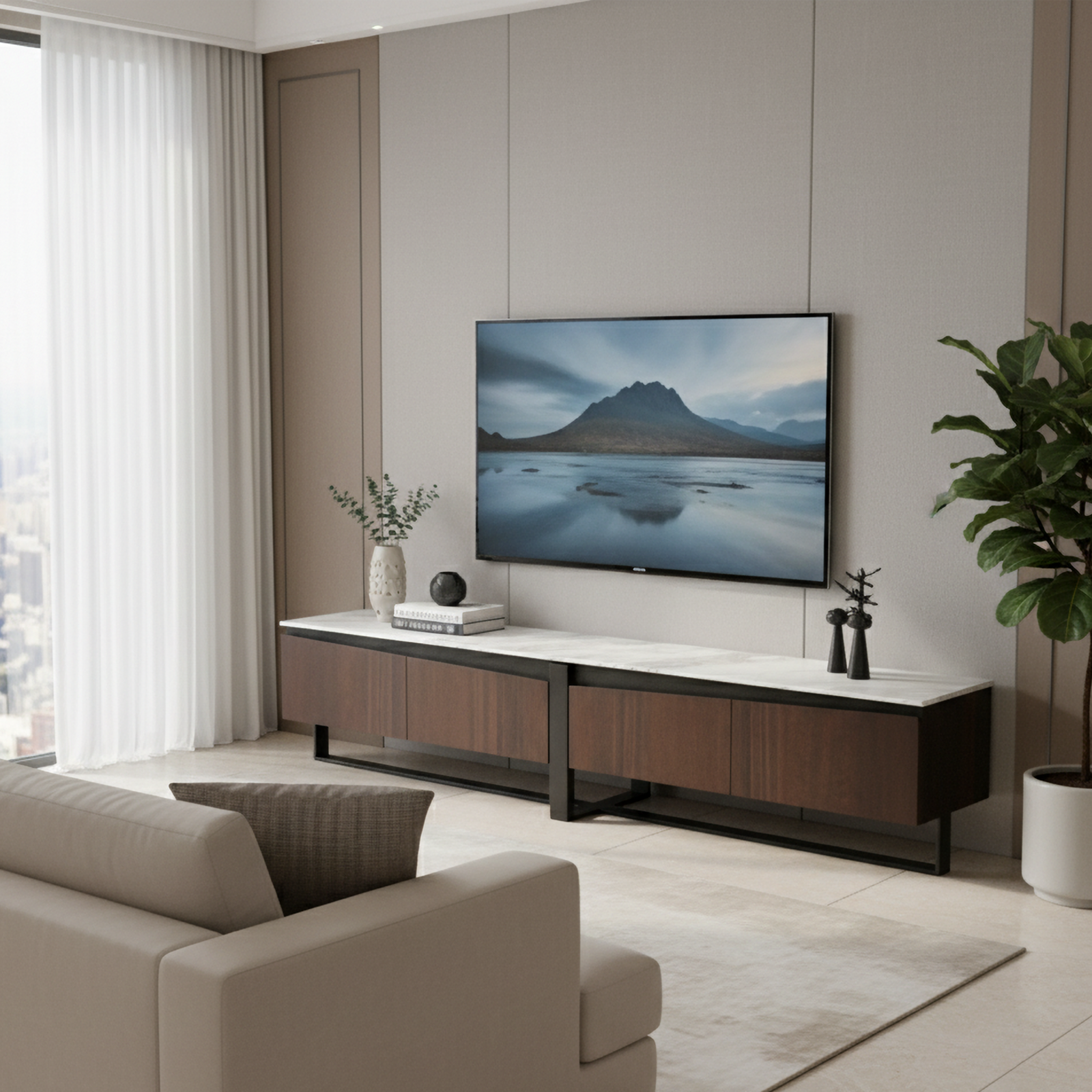 Complete your living room with the Tecton Media Console, a striking statement of modern architectural design. As a key piece in the Tecton collection, it is designed to perfectly complement the Tecton coffee table, creating a unified and sophisticated aesthetic. Its luxurious materials and ample storage make it the ideal anchor for your entertainment center.